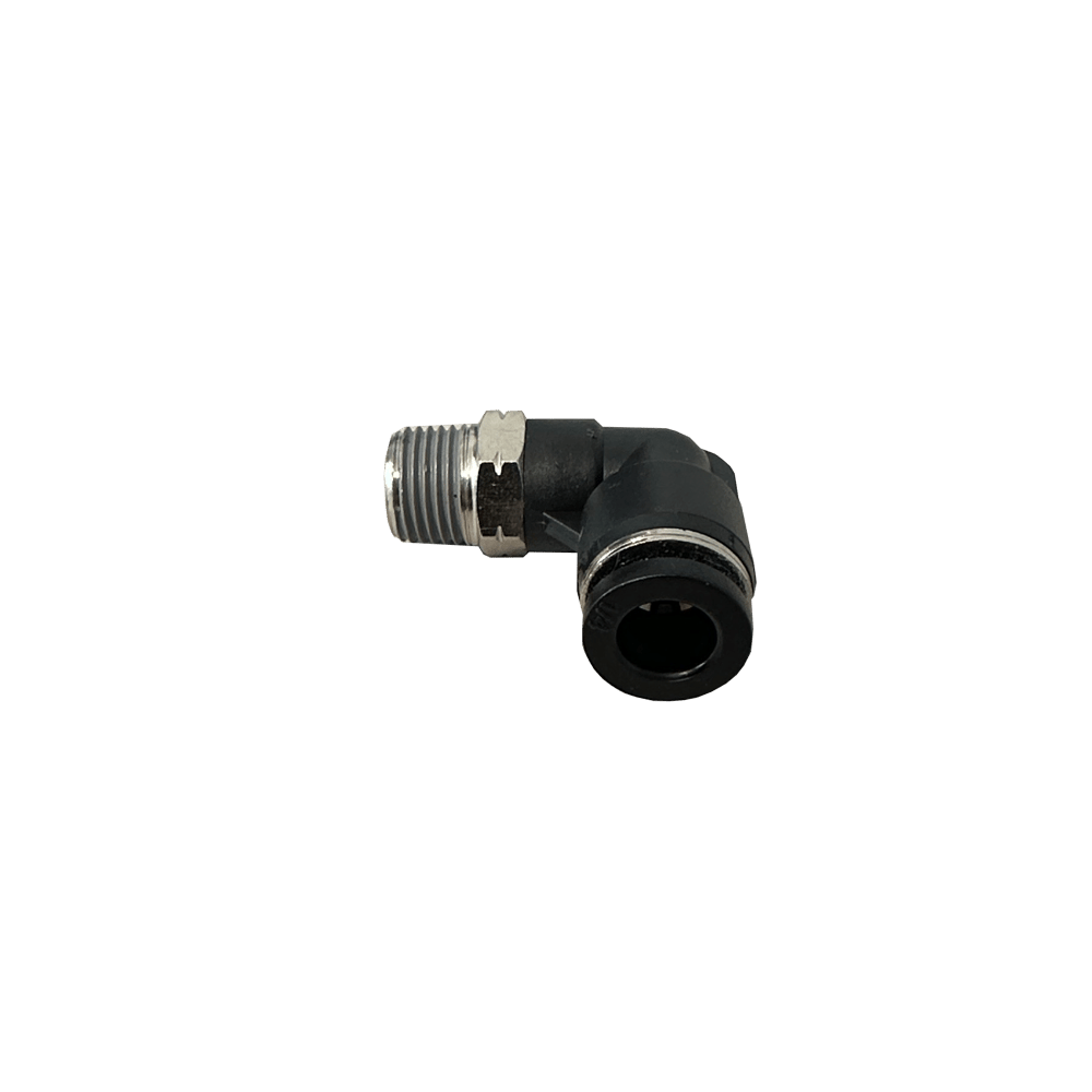 90 degree push fitting with 1/8" NPT thread and 1/4" Push-on Airline. These are the fittings that go on all of our air cylinders.