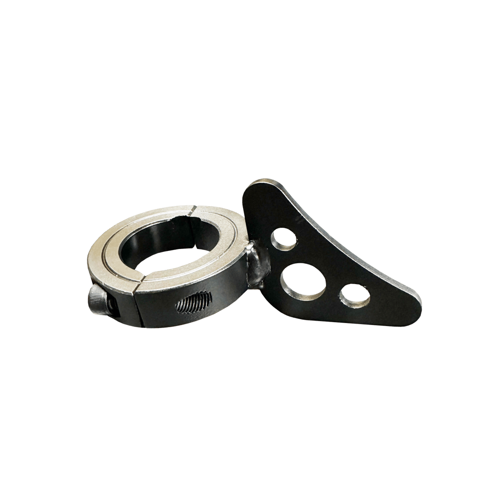 We made this bracket to clamp around a 1" PVC Pipe giving you a 5/16" Hole to connect your linkage rod to. Some Haunters choose to use PVC for their homemade mechanisms. You can simply clamp this on (you will need an allen key for the bolts) and find the mounting position you like, versus drilling a bunch of holes in the PVC. It also eliminates wear and tear that can occur if you were to drill a hole and connect your linkage directly to the PVC by not rounding out the hole overtime.