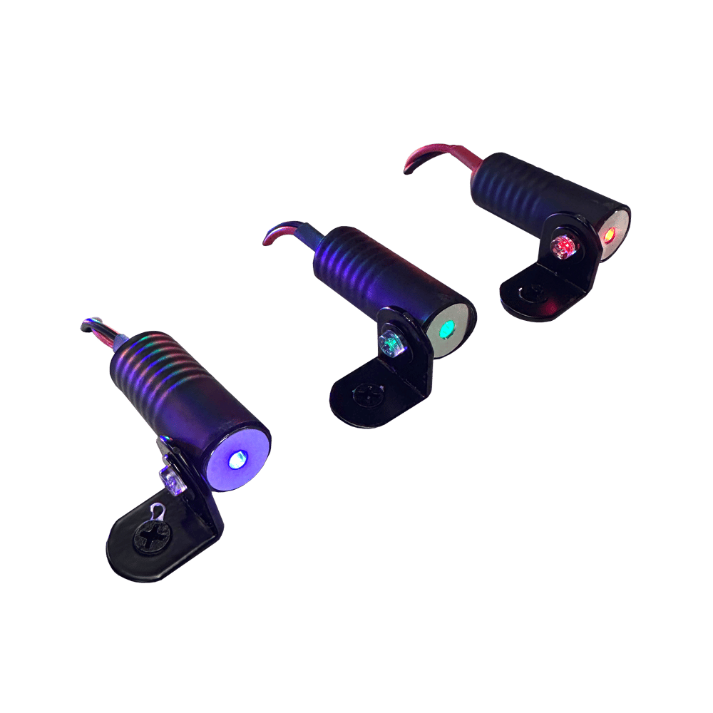 Our 12 Volt Micro LED Lights work great for lighting up your scenes! Aluminum housing with a 1.5 Watt LED. Available in Red, Green, Blue, Yellow, Purple (UV), and Cool White. You can hook a bunch of these up to a 12 volt 5 amp power adapter. Our Micro LED Lights DO NOT have a halo like some LEDS do. These provide a smooth light distribution.